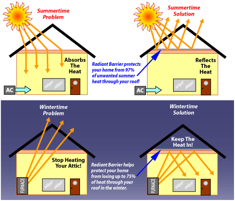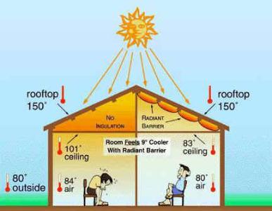 A single, thin coat of our spray applied to the underside of your roof deck will block up to 84% of the sun's radiant heat from entering your home through the attic. And in winter, the same barrier will reflect back up to 84% of the heat that tries to escape from your home through the attic. Yet unlike foil substrates, our radiant barrier spray can be applied in a matter of hours instead of days. It goes on evenly, with no gaps or holes. And because it is sprayed on, it can easily be applied to existing roofs. |